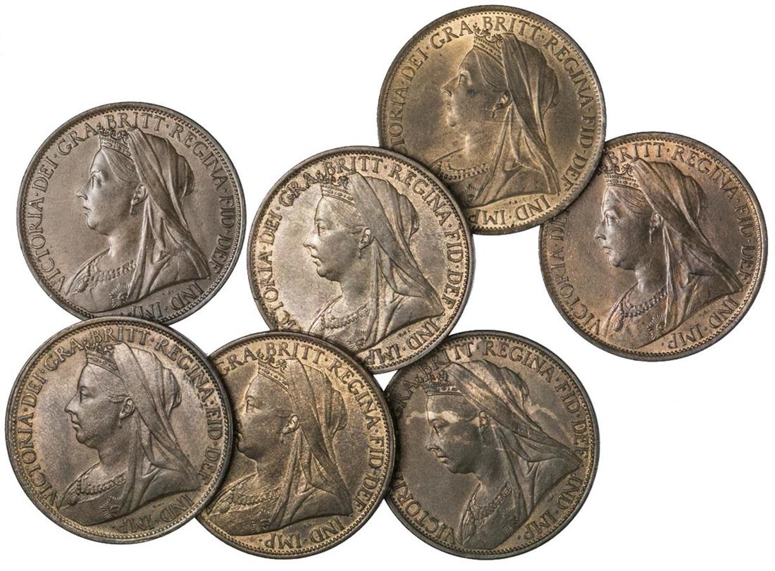 Great Britain. Victoria (1837-1901). Complete set of Veiled head Pennies: 1895-1901. Missing only variety. S.3961, KM 790. Uncirculated-Brilliant Uncirculated. (7)