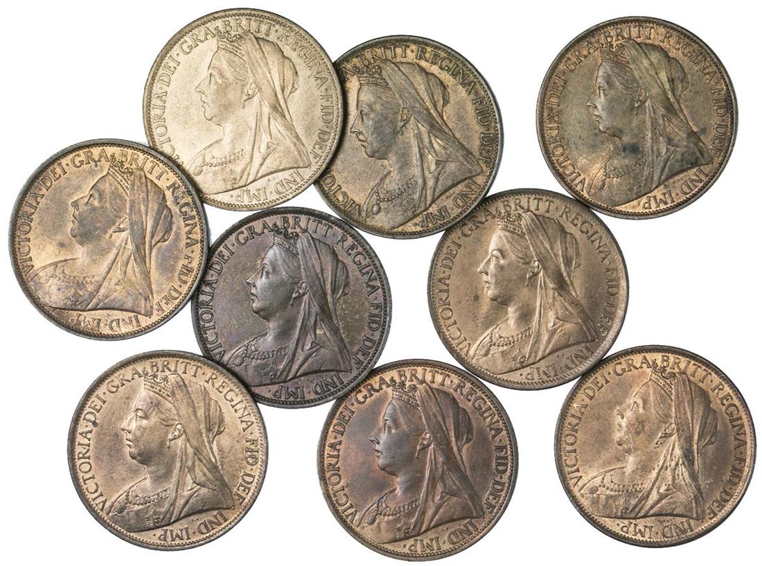 Great Britain. Victoria (1837-1901). Run of high-grade Veiled head Pennies: 1895, 1896, 1897 (2), 1899, 1900 (2), 1901 (2). Uncirculated-Brilliant Uncirculated. (9)