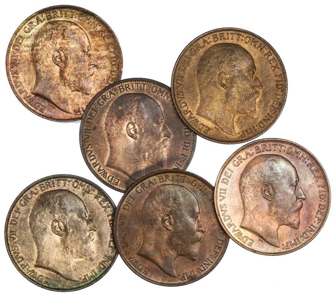 Great Britain. Edward VII (1901-1910). Sextet of Pennies: 1903, 1905, 1906, 1908, 1909, 1910. Bare head right. S. 3990, KM 794.2. The 1906 About Uncirculated, the others Uncirculated-Brilliant Uncirculated. (6)
