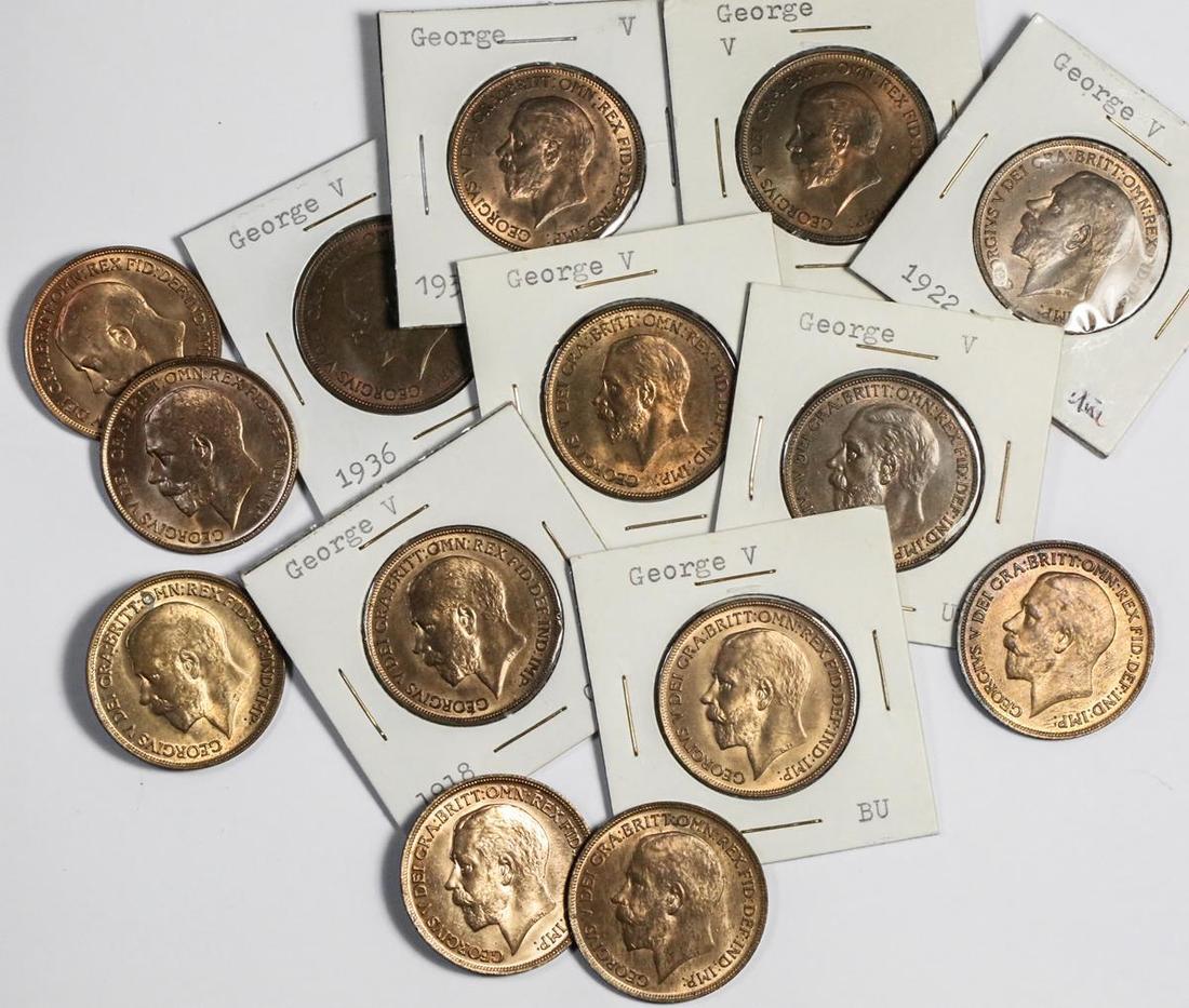 Great Britain. George V (1910-1936). Run of high-grade Pennies. Includes: 1912, 1913, 1914, 1916, 1917, 1918, 1919, 1921, 1922, 1927, 1929, 1931 and 1936 (2). Bare head left. S.4051, 4054A, 4055; KM 810, 826, 838. Uncirculated-Brilliant Uncirculated. (14)