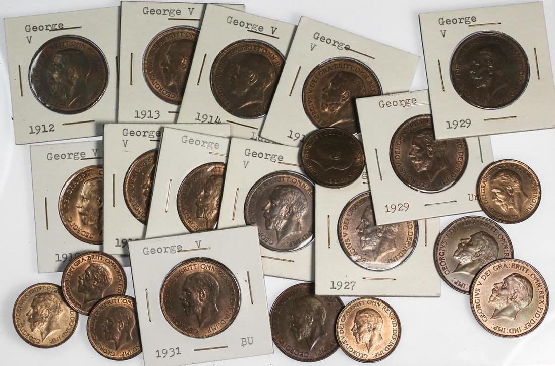 Great Britain. George V (1910-1936). Lot of high-grade AEs. Includes: Pennies. 1912, 1913, 1914 (2), 1919 (2), 1921 (2), 1927, 1929 (2), 1931, 1936 (3). Bare head left. S.4051, 4054A, 4055; KM 810, 826, 838; and Halfpennies. 1923, 1927, 1929, 1930, 1932, 1934 Uncirculated-Brilliant Uncirculated. (21)