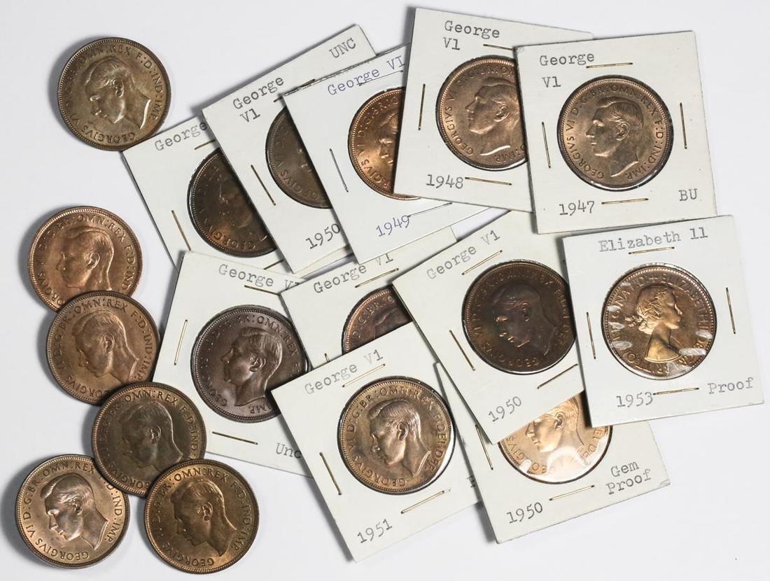 Great Britain. George VI (1936-1952). Complete high-grade set of Pennies, 1937-1951. KM 845, 869. The 1944 AU-Uncirculated, the others Uncirculated; also Proof Pennies 1950 (2), 1951 (2) and Elizabeth II. 1953. Brilliant Proof. (17)