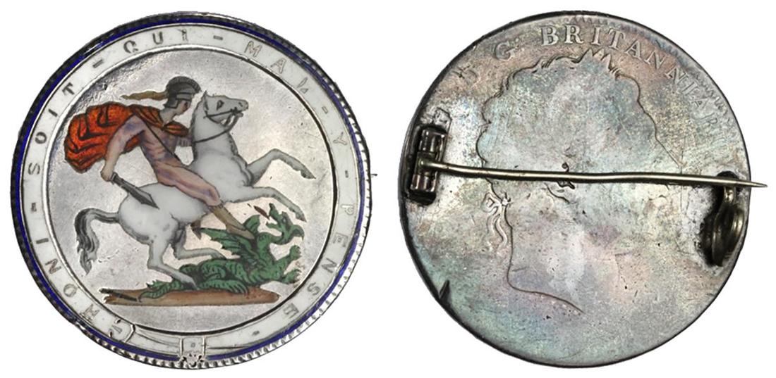 Great Britain. George III. Enameled reverse of an 1818-1820 Crown. Legend against white enamel, Pistrucci's St. George and dragon in white, red, green, yellow and fleshtone. Brooch pin on worn obverse. Attractive. Some contact marks from wear, Very Fine.