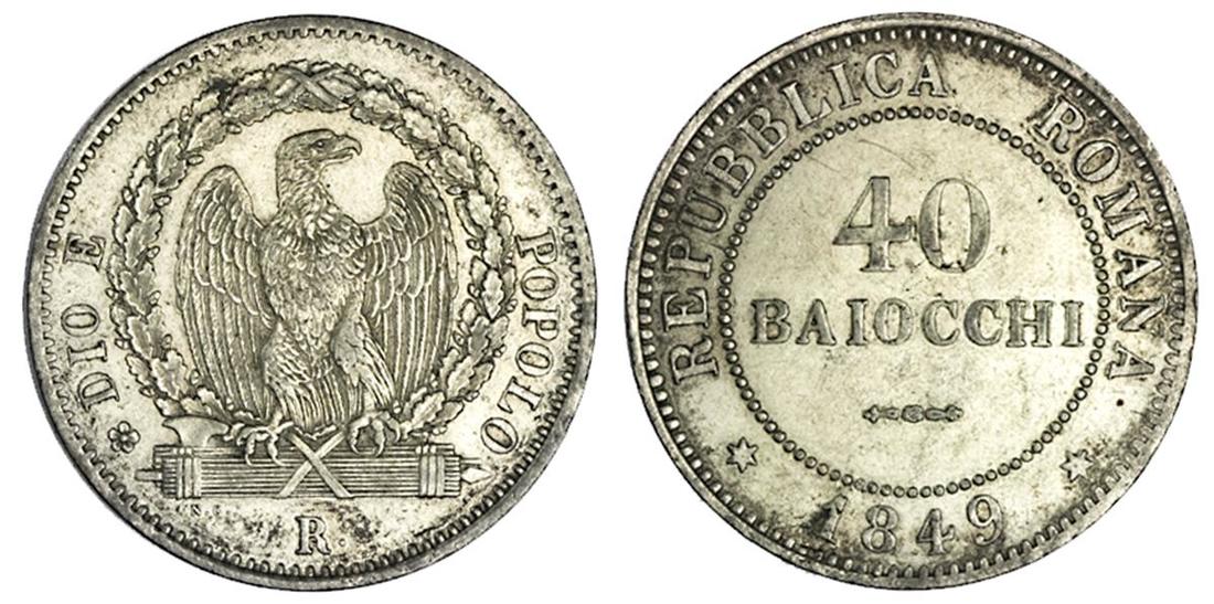 Italian States. Roman Republic. 40 Baiocchi, 1849 R. Roma. Eagle standing on fasces within wreath. KM 27. Good Extremely Fine.