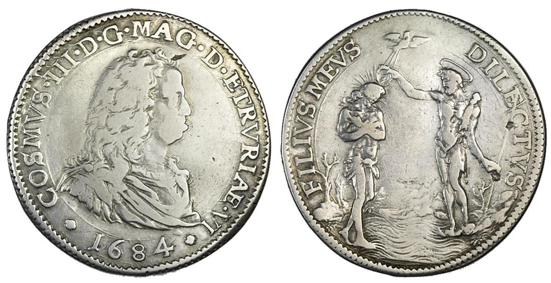 Italian States. Tuscany. Cosimo III di Medici (1670-1723). Piastre, 1684. Draped and armored bust right, date below, rev. Baptism scene in the River Jordan. Dav. 4212. Once wiped. About Very Fine.