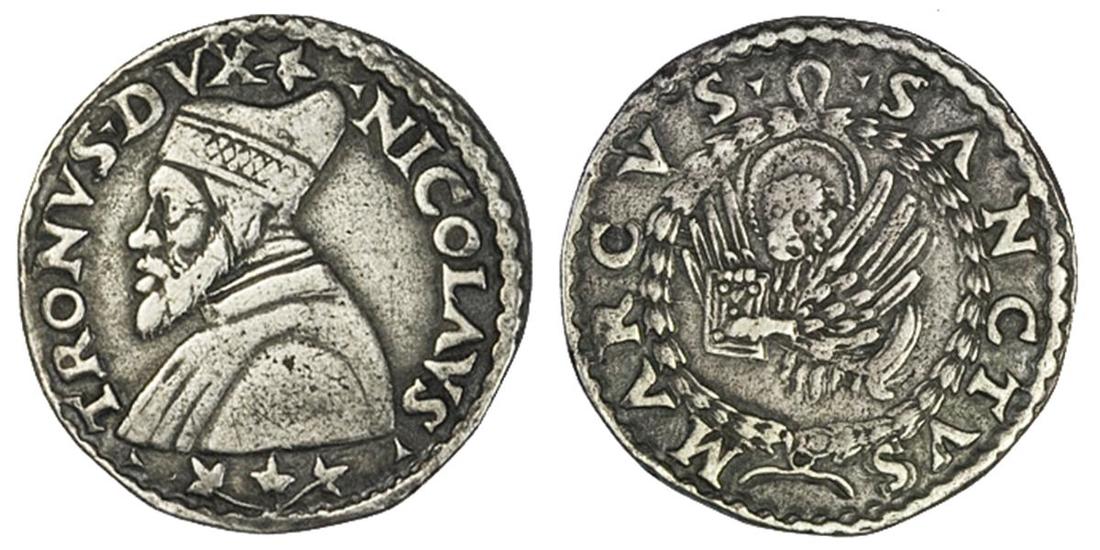 Italian States. Venice. Nicolò Tron, Doge (1471-1473). Trono (Lira da 20 Soldi). 6.17 gms. Draped bust of the doge left, wearing ducal biretta, three leaves below; .NICOLAVS..TRONVS.DVX (leaf) - triangular stops, rev. Winged lion of San Marco facing within wreath; S?NCTVS M?RCVS - triangular stops. CNI VII p.147, 22; Paol. 45/2; Biaggi 2901; Papa.9. Venice secured Cyprus during Tron's reign, arresting Ottoman movements in the area through its alliance with the local ruler Uzan Hassan Beg. The Serene Republic's military activities though were costly causing the doge to reform the coinage, which included a new denomination, named after himself, the "Trono". The new coin probed unpopular and the Venetians were offended by the doge's self-promotion. After Tron's death in 1473, the coin was immediately withdrawn.. Toned over light old hairlines, slight graininess. Full, broad flan. Very Fine.