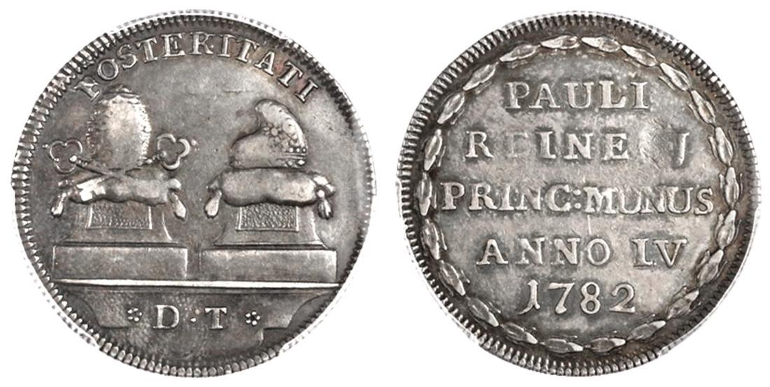 Italian States. Venice. Paolo Renier (1779-1789). Osella, 1782 DT (Domenego Trevisan). Anno IV. Commemorating the Visit of Pope Pius VI to Venice. Papal tiara over crossed keys on cushion beside cushion with Doge's cap, * D.T* in exergue, rev. Four-line legend and date within wreath. CNI VIII 535/163; Paolucci 265. PCGS XF 45.