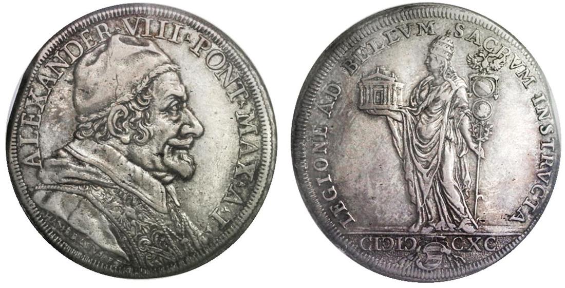 Papal States. Alessandro VIII (1689-1691). Piastra (Scudo da 80 Bolognini), MDCXC (1690). Anno I. Capped Pontifex bust right, rev. The Church standing left, holding an elaborate standard and a church. B.2173, Dav.4100, KM 528. Nicely toned over some minor hairlines. NGC XF 45. Ex Heritage, May 2015, lot 65078.