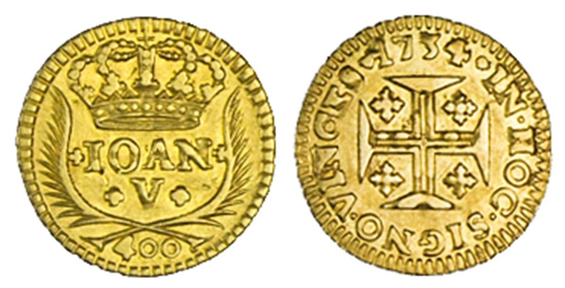 Portugal. João V (1706-1750). 400 Reis (Cruzado Novo - Pinto), 1734. Crowned IOAN V within spray, value below, rev. Jerusalem Cross. Fr.100, KM 201. Extremely Fine.