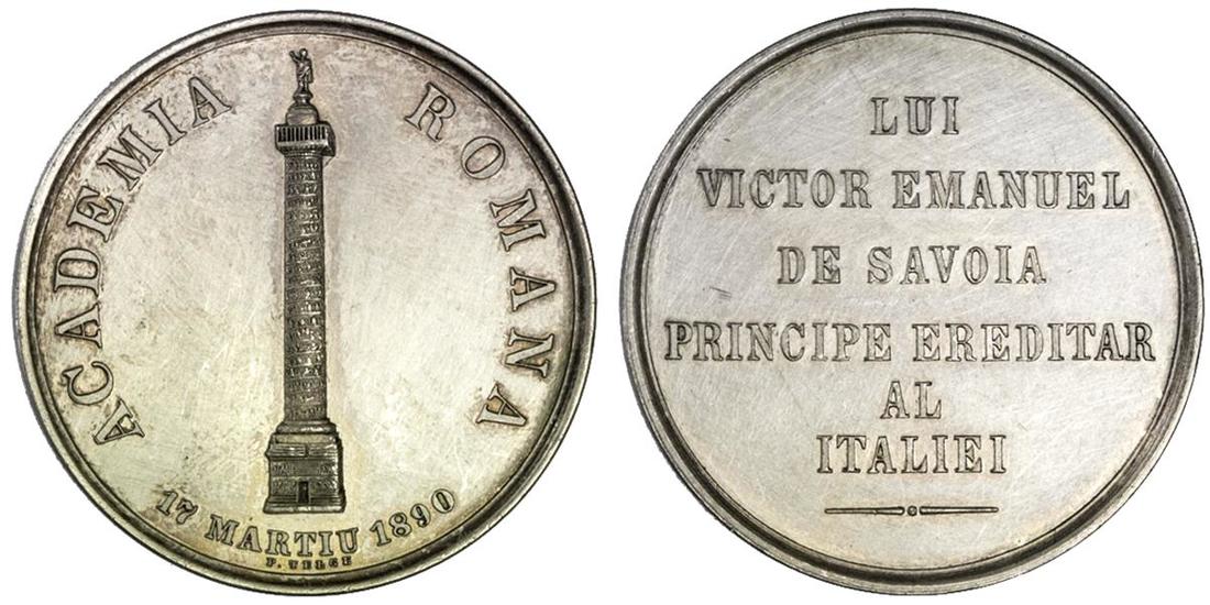Romania. Academia Romana Homage to Prince Vittorio Emanuele Medal, 1890. Silver. 47.3 mm. By P. Telge. Column with Roman statue atop, date "17 MARTIU 1890" below, rev. LUI VICTOR EMANUEL DE SAVOIA PRINCIPE EREDITAR AL ITALIEI in six lines. Light friction hairlines. Extremely Fine.