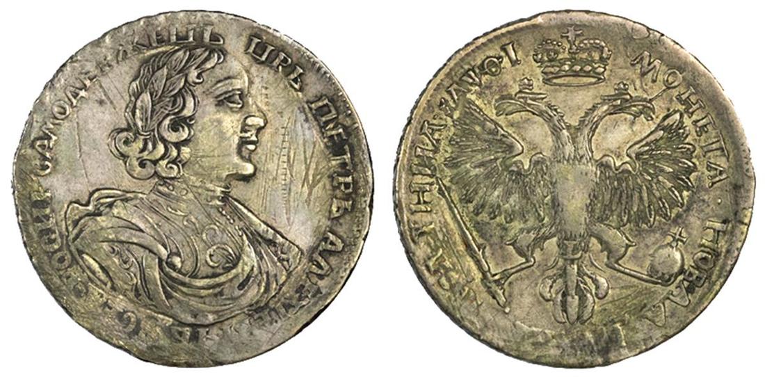Russia. Peter I, "the Great" (1689-1725). Poltina, Cyrillic date 1719. 14.24 gms. Laureate, draped and cuirassed bust right, rev. Crowned Imperial eagle. KM 156. Slate gray over old obverse scratches and crude filemark reverse edge. About Extremely Fine.