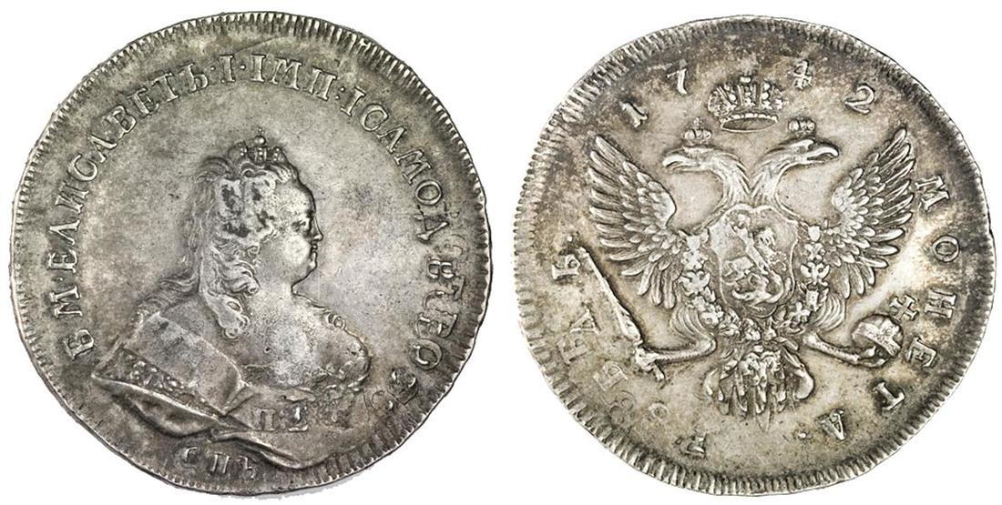 Russia. Elizabeth (1741-1761). Ruble, 1742 C??. Crowned and mantled bust right. C.19b.3. Some double-striking in legends. Soft slate-gray tone. About Extremely Fine.