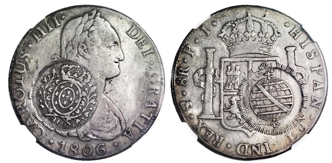 Brazil. Minas Gerais. Counterstamped Coinage of 1808. 960 Reis (1808). Arms and globe c/s on Potosí 8 Reales, 1806 PJ. NGC VF Details - Mount Removed.