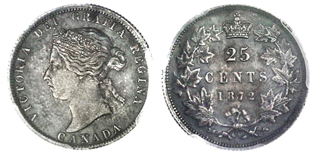 Canada. Victoria (1837-1901). 25 Cents, 1872 H. Heaton. Head left wearing tiara. Attractive old toning. PCGS AU 55.