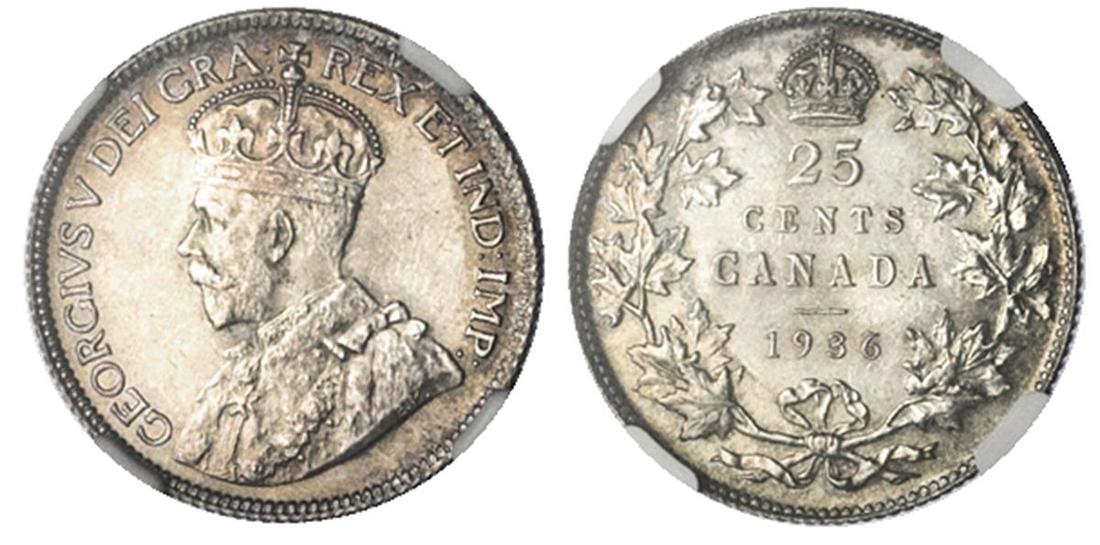 Canada. George V (1910-1936). 25 Cents, 1936. KM 24a. NGC MS 63.