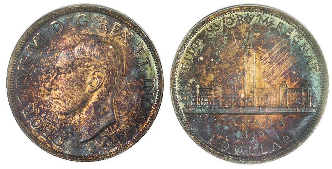 Canada. George VI (1936-1952). Dollar, 1939. Royal Visit. KM 38. Attractive deep iridescent violet and orange with cobalt blue peripheral hues. PCGS SP 65 Matte.