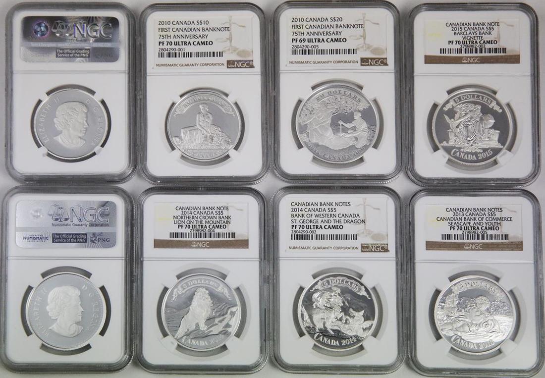 Canada. Assortment of NGC Certified Canadian Bank Note Series Coins. All ULTRA CAMEO. 1-2) 2010 $10 First Canadian Banknote PF 70. 3) 2010 $20 First Canadian Banknote PF 69. 4) 2013 $5 Seascape & Youth PF 70. 5-6) 2014 $5 St. George & the Dragon. PF 70. 7) 2014 $5 Lion on the Mountain. PF 70. 8) 2015. Barclays Bank PF 70. (8)