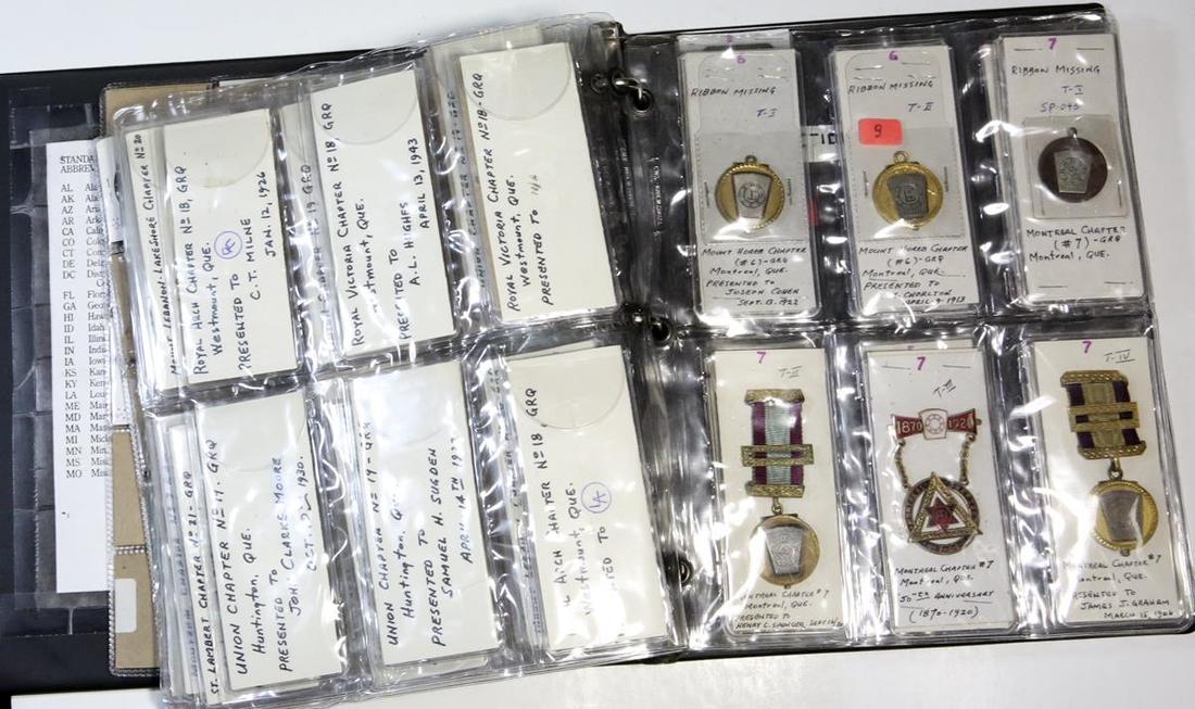 Canada. Small display album of Masonic Chapter Pennies, Badges and Medals from Quebec. 20th Century; various chapters and lodges in La Belle Province. Includes: Badges, medals, and pins (52) - mostly ribboned; Chapter Pennies (31) and a Made a Mason token. About Very Fine-Uncirculated. (84)