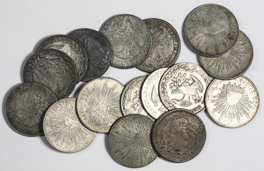 Mexico. Republica. Lot of Cap 'n Rays 8 Reales. Includes: Chihuahua -- 1875 MM (2), 1877 EA; Guanajuato -- 1829 MJ, 1838 PJ, 1876 FR; San Luis Potosi -- 1877 MH (2); Mexico City -- 1841 ML, 1876 BH, 1878 MH; and Zacatecas -- 1844 OM, 1864 MO, 1873 YH, 1876 JA, 1878 JS. About Very Fine-About Uncirculated. (16)