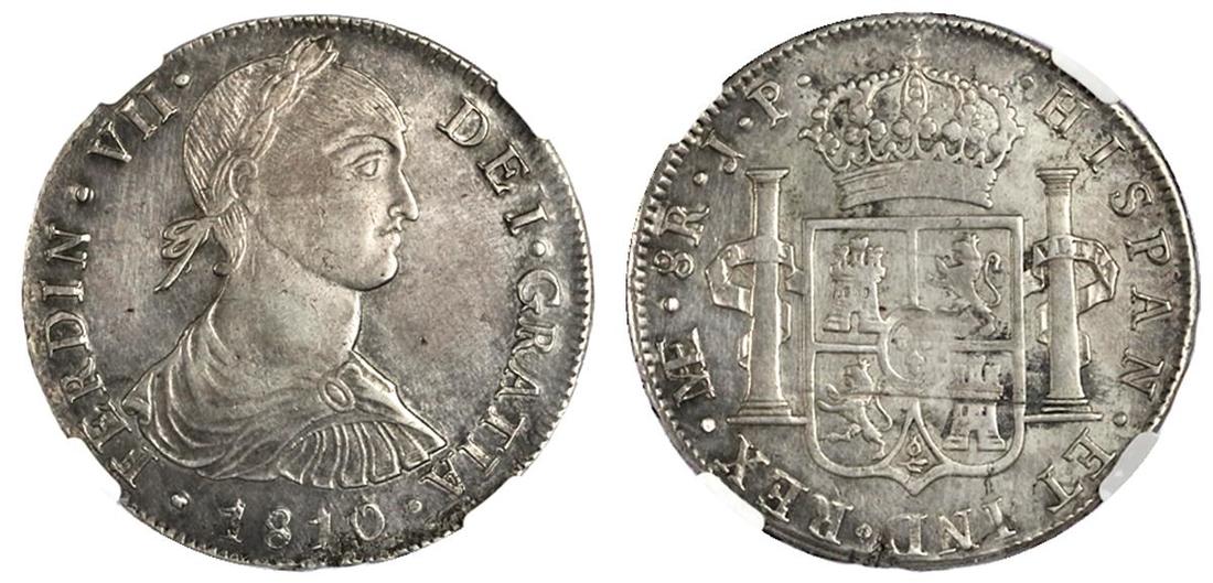 Peru. Fernando VII (1808-1822). 8 Reales, 1810 JP. Lima. Smaller, imaginary bust right, rev. Crowned Arms flanked by Pillars. KM 106.2. NGC XF 45.