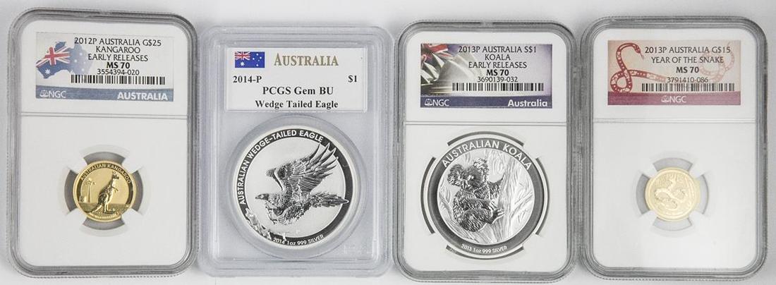 Australia. Modern Certified Gold and Silver. 2013P $15 Year of the Snake NGC MS 70; 2012P $25 Kangaroo Early Releases NGC MS 70; 2013P Koala $1 Early Releases NGC MS 70; 2014P $1 Wedge Tailed Eagle PCGS Gem BU. (4)