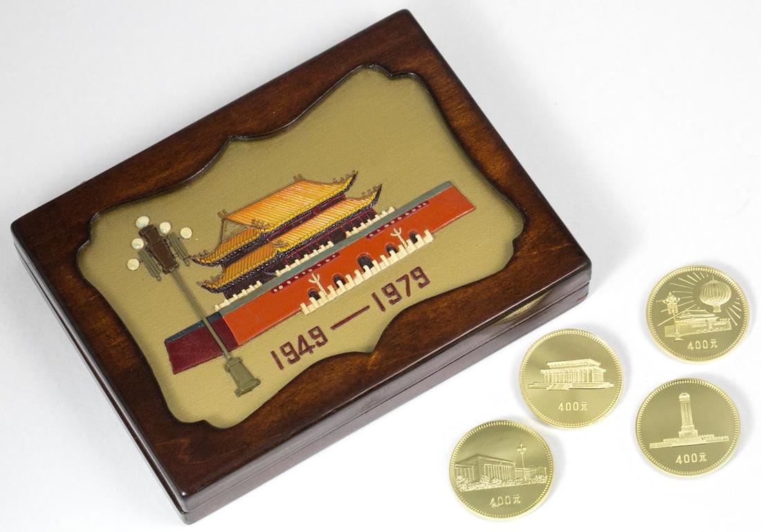 China. People's Republic. Four-piece Gold 400 Yuan Proof Set, 1979. 30th Anniversary of the People's Republic. Tiananmen, Monument to the People's Heroes, Chairman Mao Memorial Hall, and Great Hall of the People. KM PS1. In attractive case of issue, with CoA. Brilliant Proof.