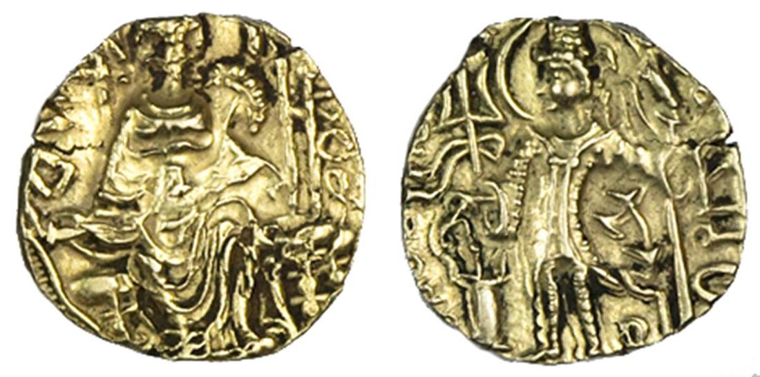 Ancient India. Kushan Empire. Kipanada (ca. 350-375). Gold Dinara. 7.69 gms. King standing left, sacrificing over altar and holding standard, filleted trident in left field, Brahmi bha and dra inner right, kipanada outer right, rev. The goddess Ardoksho enthroned facing. M3583, MK 595. Extremely Fine.