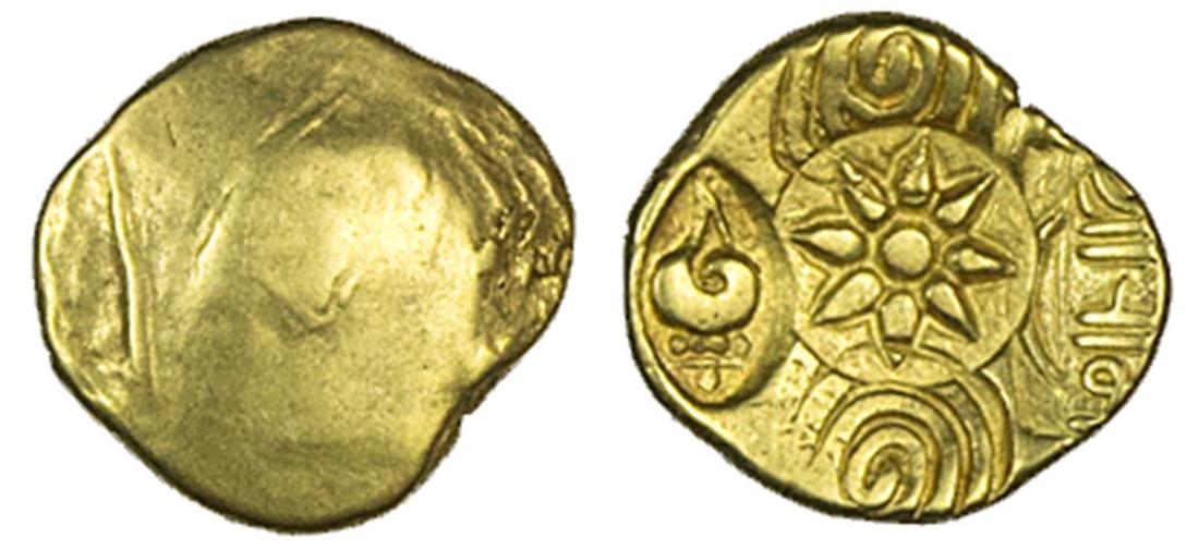 India. Yadavas of Devagiri. Ramachandra (1270-1311). Gold Pagoda. 3.78 gms. Uniface. Central louts punch surrounded by two Sri punches, conch and ruler's name. M.289, Deyell p.227-8. About Extremely Fine.