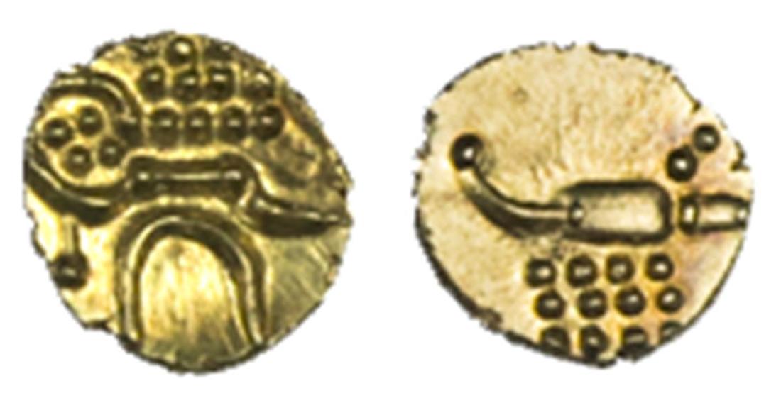 India. Princely States. Cochin. Gold Fanam (ca. 1795-1850). 0.39 gms. KM 10. Likely restrike made from melted Sovereigns. Uncirculated.