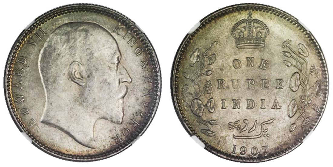British India. Edward VII (1901-1910). Rupee, 1907 (C). Bare bust right. NGC MS 63.