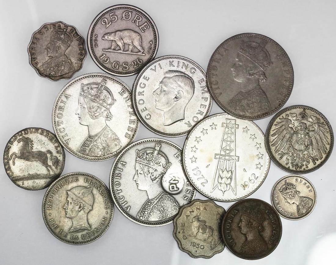 Baker's Dozen -- Indian, African and miscellaneous coins. Includes: Rupees of Bikanir, 1892 and Alwar, 1891 (once cleaned), Raj (3) and India Republic minors; Mozambique. Rupee (1889). PM c/m on British India Rupee, 1878; Reunion Franc, 1896; Greenland 25 Øre, 1926; New Zealand AU 1941 Florin, others (3). The reunion Fine, the rest generally Very Fine-Extremely Fine. (13)