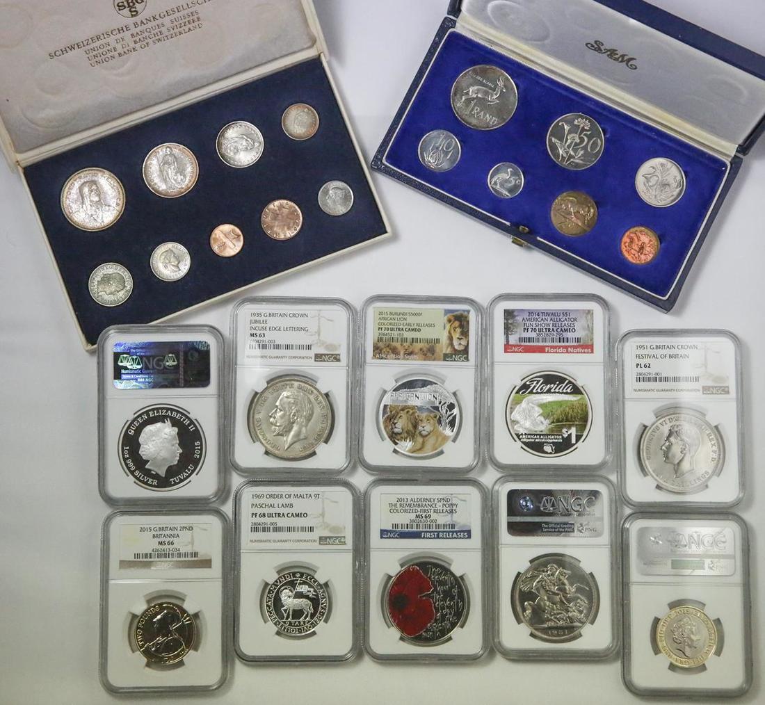 Great Britain and British Commonwealth NGC Certified Coins, 1935-2015. Great Britain: 1935 Crown Jubilee MS 63; 1951 Crown Festival of Britain PL 62(2 pcs.); 2015 2 Pound Brittania MS66(2pcs.); Alderney 2013 5 Pound Remembrance Colorized MS 69; Burundi 2015 African Lion Colorized Early Releases PF 70 ULTRA CAMEO; Malta 1969 9T Paschal Lamb PF 68 ULTRA CAMEO; Tuvalu: 2014 $1 American Alligator Fun Show Release PF 70 ULTRA CAMEO; 2015 $1 Florida Panther Fun Show Release PF 70 ULTRA CAMEO. Also included is a 1968 South african 7-piece Proof Set, and a 1965 Swiss 9-Piece Mint Set.