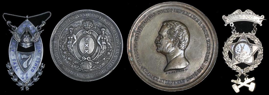 Medals and Badge quartet. Medals: Netherlands. International Competition for Arts and Crafts, Amsterdam 1877. Medal. Silver. 55 mm. Craftsmen working, Victory standing in background. Pinscratches in obverse field; Poland. 60th Anniversary of Marshal Berg, 1872. Bronze, 69 mm. By Jan Salomon Minheymer. Bust left. H-Cz 5378. Tooling and minor deposits in periphery; Badge or 'Jewel' of the Companions of the Forest. Name on top bar "Edavenel". Engraced on back PRES. BY Fleur de lis Circle No. 602.. Unmarked, but possibly gold-filled or low-grade gold. 5.43 gms; and small silver badge "Athletic Association Fall Games '84" (1884). Winged Viking helmet with "7', large '7' below. About Extremely Fine-Extremely Fine. (4)