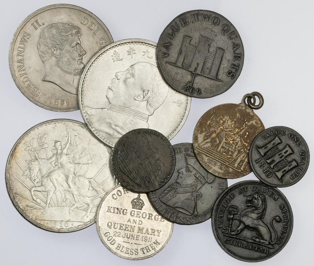 World Miscellanea. Includes: China. Uncirculated Year 9 Yuan Shih-kai Dollar Y.329.6; Gibraltar. 2 Quarts, 1802 (Keeling), 1820 (Spittles), Keeling Quarts, 1802 and 1810; Mexico. 1910 'Caballito' Peso; Naples & Sicily. 120 Grana, 1856 (hairlines); British 1795 Halfpenny Token and small George V Coronation medal - "Souvenir of the Garden Party Given by Henry Clarke J.P.; and Russia, 1812-1912 Brass medalet. Alexander I head (reverse staining). Very Fine-Extremely Fine. (10)