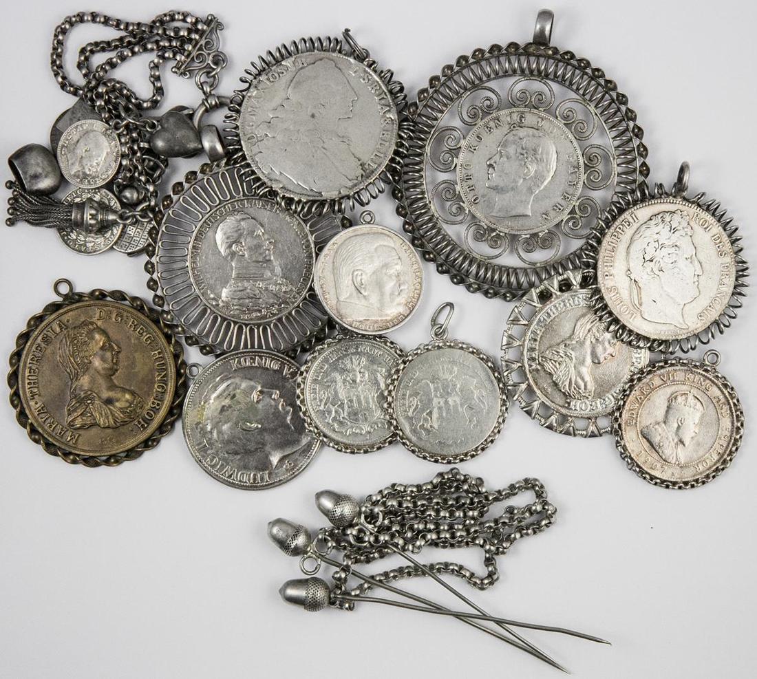 Silver Coins set as Silver Pendants. Aggregate weight: 221.97 gms Includes: 1913 Prussian 3 Mark in ornate openwork frame linked with Gypsy Charms - cat and ball, saddle, heart, beggar boy, small coins etc.; Bavarian 3 Mark, 1909 in openwork frame, 1764 Bavarian Taler and French 1834 5 Francs in coil frames; Hamburg 2 Mark (2) in link frames; Hindenburg 5 RM; and silver cloak pins on link; also two medallic/jewelry pieces in pendants possibly silver, 1907 Jamaican Penny in bezel, and AE jewelry Maria Theresa piece. Coins grade Fine-Extremely Fine. (12)