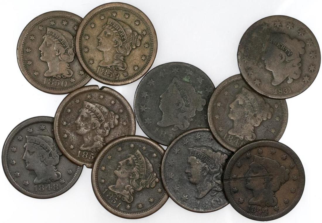 U.S. Large Cent Grouping. 1816 About Good details; 1819 Fine details, scratch; 1831 AG; 1841 cull; 1848 Fine, scratch; 1848 Fine; 1850 F-VF; 1851 VF, dark; 1851 cull; 1853 VF-EF. [10]