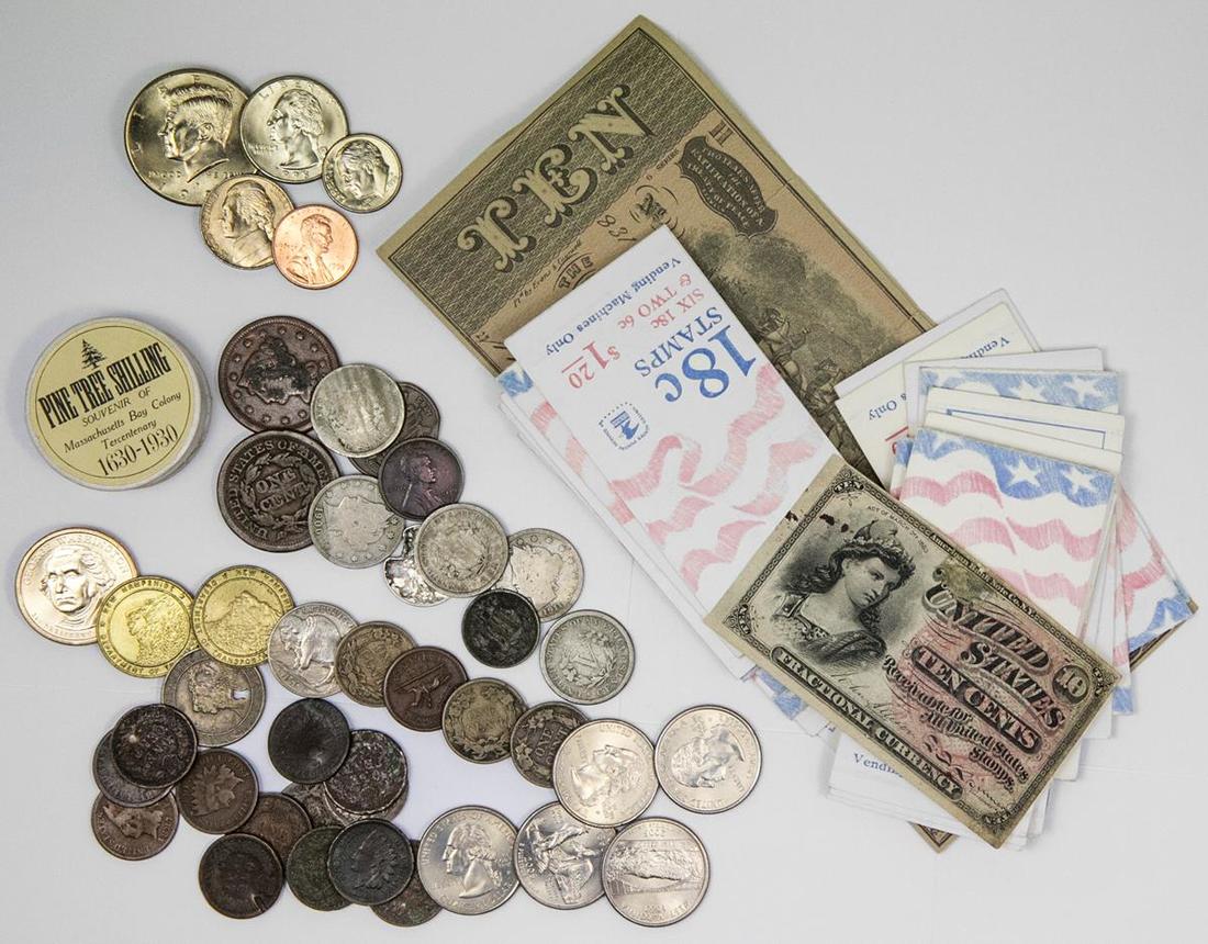 Interesting Group of U. S. Cents and Others. 1851 Large Cent counterstamped "D. McFarland" twice across the obverse. Fine; 1847/1848 gambler's Large Cent VG (heads on both sides); 1863 Husssey's Special Message Post Civil War Token, EF details, some verdigris; 1857 Flying Eagle Fine-VF(2), 1858 VF-EF; Cull Indians(13); 1883 Nickel With Cents VG; Four assorted V nickels AG-Good; Cull Two Cent and Nickel Three Cent; 1917 Buffalo Nickel AU.