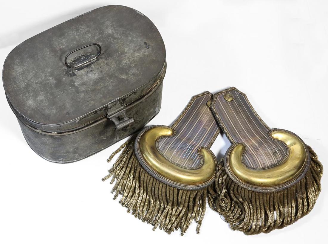Great Britain. A pair of Epaulettes of an Officer of the 82nd Regiment of Foot (Prince of Wales). Ca. 1840. Gilt crescent over silver and gilt thread, brass regimental button at end, bullion lace border. Normal age toning, light scuffs on red underside cushioning. In original metal case (minor ding and scuffed). Ex Hammatt Collection.
