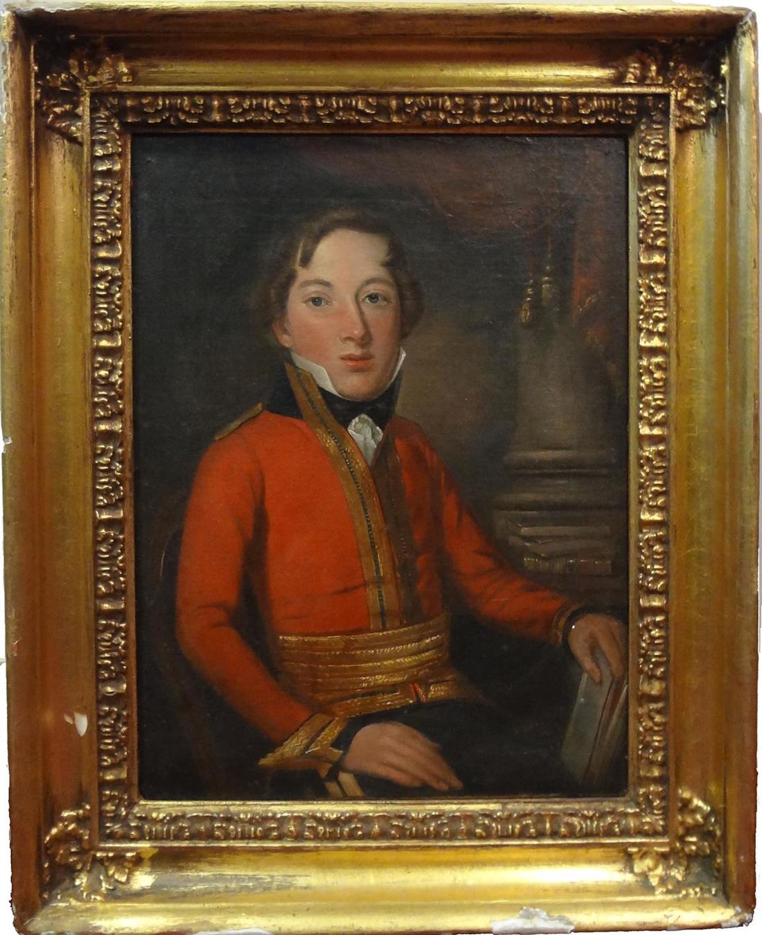 Great Britain. Portrait of Boy Soldier . 19th Century. Oil on board. Unsigned. Interior: 13 1/3 x 18". Facing adolescent ¾ right in dress tunic, seated before draped column. In old, ornate frame (some nicks). Ex Hammatt Collection.