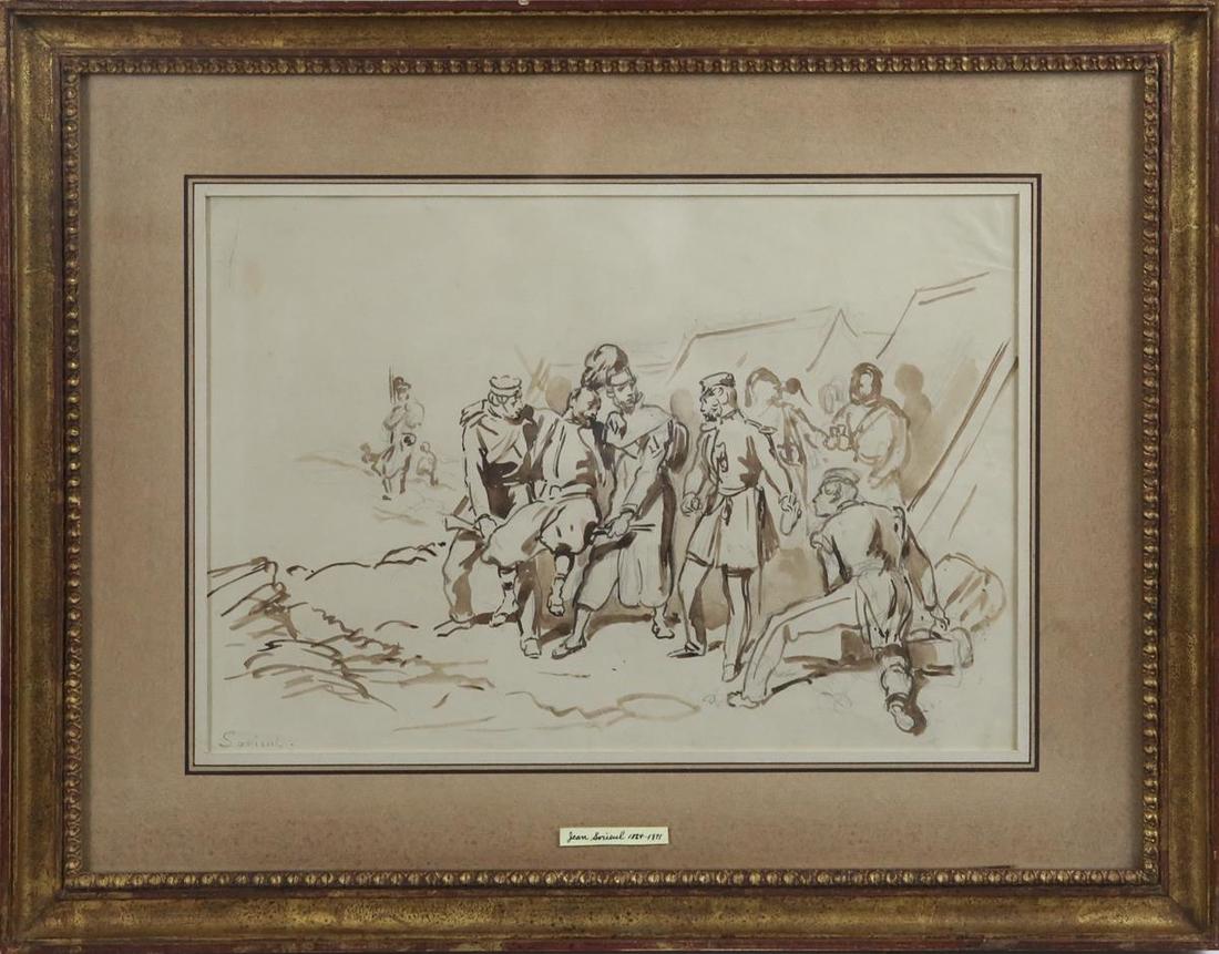 Crimean War. Guerre de Crimée. Zouave secouru par les Anglais. Original brown brush and pencil drawing with brown wash by Jean Sorieul (1824-1871). 8 ½ x 12 ¼". A lively composition depicting a wounded Zouave carried on a rifle brace by two British soldiers to a camp doctor. Sorieul was a student of Hippolyte Bellangé and L. Cogniet, becoming well-known as a historical painter. Small repair near upper edge on the sky. Attractively matted and framed, 18 x 14 ½".