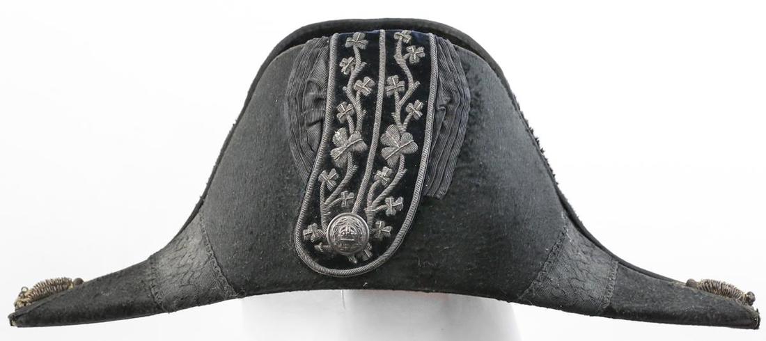 Ireland. Official's Ceremonial Bicorne Hat. Early 20th Century. Black lamb's wool bicorne, cloth sash on one side with clovers, and crown button two silver cloth, clover-pattern bands on same side. Silver thread thistle adornments front and back. Maker's name on inside red liner: W.CONAN 44 KILGARE STREET DUBLIN. Excellent condition. Ex Hammatt Collection.