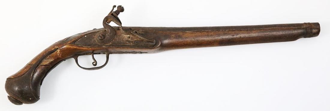Ottoman Empire. Flintlock Holster Pistol. 18th-19th Century. Goose-neck hammer, wire braid wrapped barrel tip. Some of the wood on the handle is cracked and frizzen is missing. Very Good.