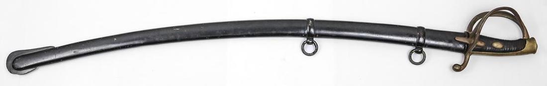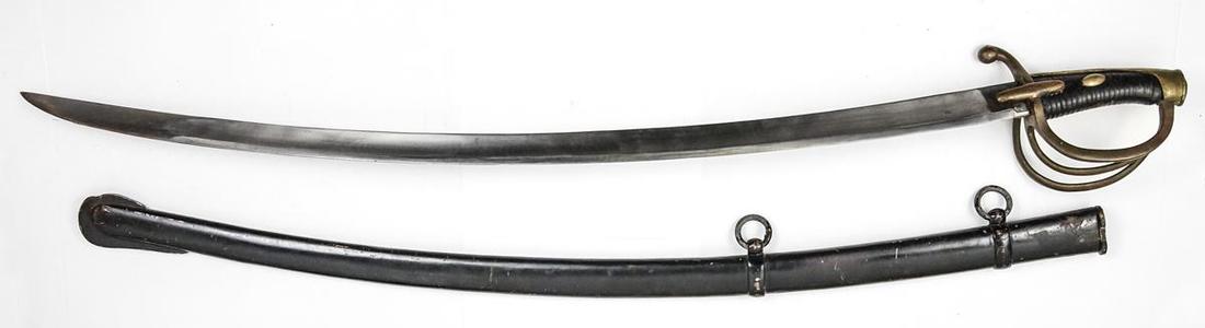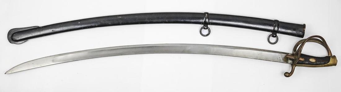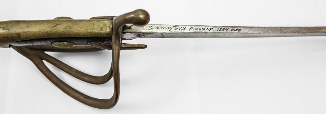 Russia. 1827 Pattern Light Cavalry Trooper's Shashka (sword). Overall length: 41 ¼". Top of blade with Russian legend engraved and date '1834'. Leather-bound wooden grip with bronze lozenge studs, brass triple bar hilt guard. Heavy, curved, 34" blade. Blackened steel scabbard. CW, 18, 14 in circle and G in circle stamped on ricasso. This was the standard Russian weapon in the Crimean War. Rare. Blade has been polished. Very Fine.