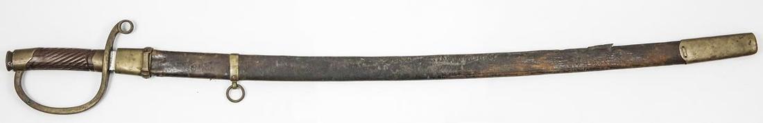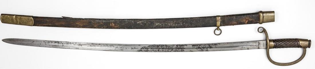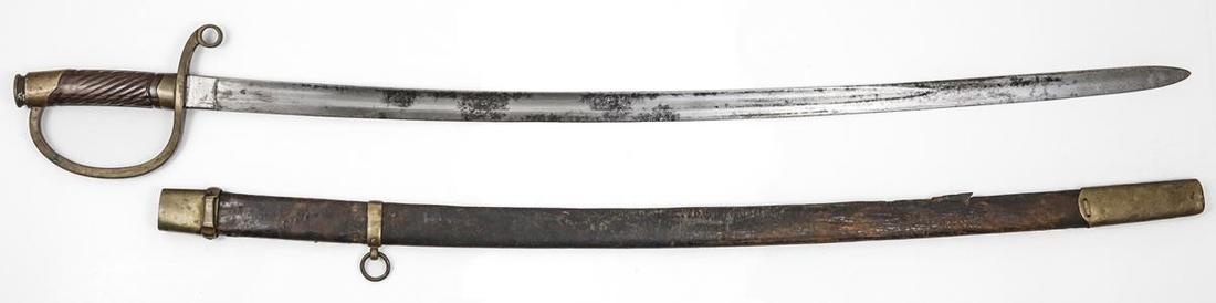 Russia. Dragoon Trooper's Shashka (Sword). Ca. 1881-1910. Overall length: 37". Brass hilt guard and pommel, ribbed grip, 31" Solingen blade, leather-wrapped wood scabbard with brass fittings. Patches of tarnish on blade, leather worn. Fine-About Very Fine.