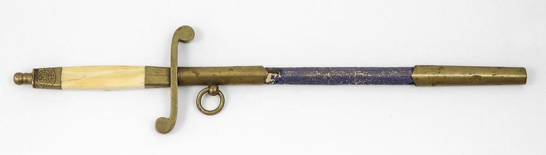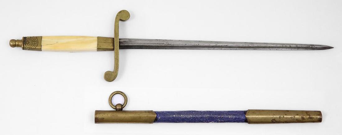 Russia. Nicholas II Imperial Dagger. Total length: 14". White celluloid grip, royal cipher of Nicholas II on brass end, brass crosspiece. Narrow, 9 1/3" blade with four ribs; purplish leather (some scuffing) and brass scabbard. Hilt somewhat loose, and tape residue on grip. Very Fine.