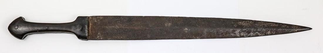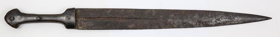 Daghestan. Kindjal. 19th Century. Traditional horn handle, riveted; 16 ¾" blade with a single, short fuller. This simple style kindjal most closely resembles the ancient Roman gladius. No scabbard. Minor stains on blade which has survived well. Fine.