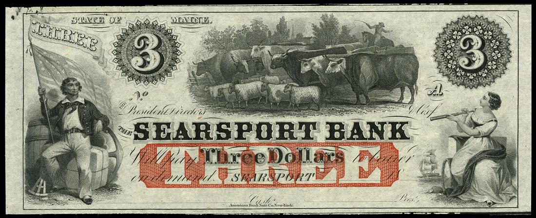 Maine. Searsport. Searsport Bank. $3. 1860s. (ME-540 G6c) THREE outlined in red. Cattle. PMG Gem Uncirculated 66 EPQ.