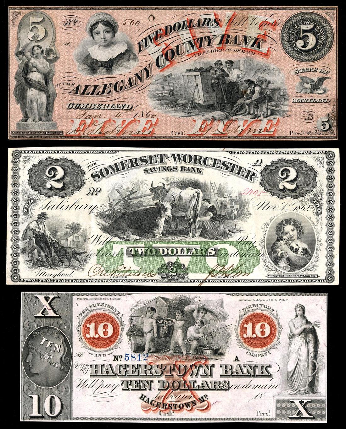 Maryland. Colorful Assortment of Maryland Obsolete Paper Money. Bank of Allegany County, Cumberland: $5 G6c VF-EF, stain. Hagerstown Bank: $5 and $10, G40b and G46b, both Uncirculated; Valley Bank, Hagerstown: $5 G6a Unc. With light teller handling; Somerset and Worcester Savings Bank, Salisbury: $2 AU, $3 and $5 all Uncirculated. [7]
