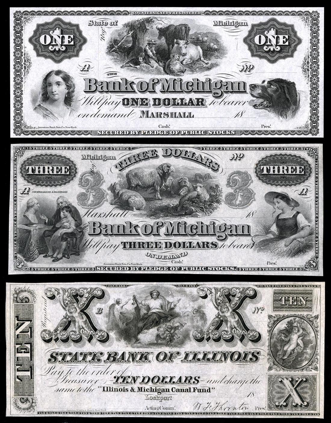 Michigan. Pleasing Selection of Michigan and Illinois Obsolete Paper Money. State Bank of Illinois, Lockport: $10 Illinois & Michigan Canal Fund, Unc. Board of Commissioners, Lockport: $2.50 1842 Unc., CC. Erie and Kalamazoo Rail Road Bank, Adrian: $5 G34b Fine. Bank of Washtenaw, Ann Arbor: $1 G40; $2 G2; $5 G14 All Unc. Millers Bank of Washtenaw, Ann Arbor: $3 G6 Unc. remainder; $5 G8 Unc. Remainder, CC. Bank of Michigan, Marshall: $1 G2; $3 G4, both Uncirculated. [10]