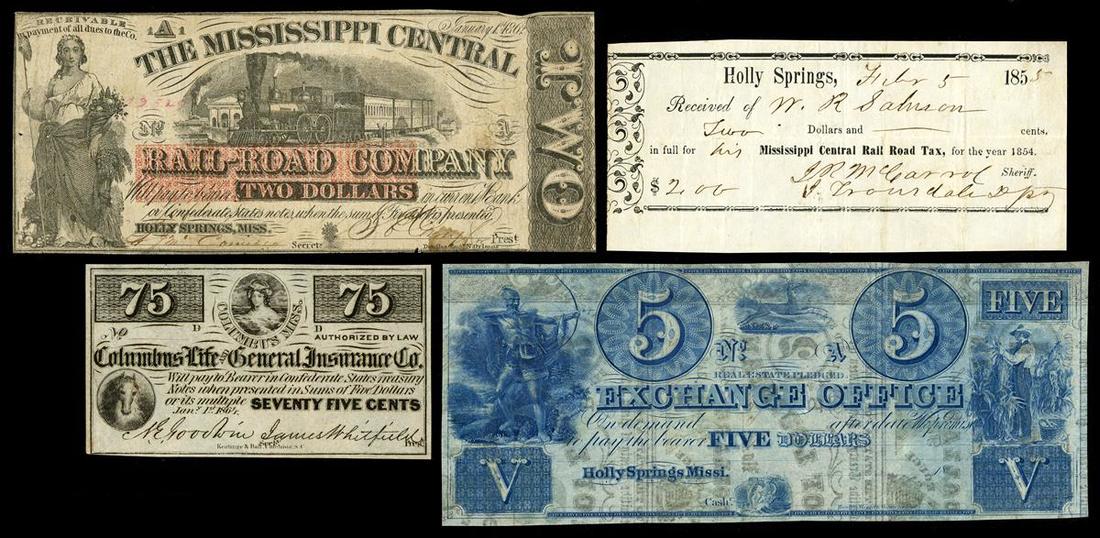 Mississippi. Pleasing Assortment of Mississippi Obsolete Paper Money. Columbus Life and General Insurance Company 75 Cents 1864(2 pcs.), both Uncirculated. Holly Springs: Exchange Office, $5, all blue, on the back of State of Louisiana scrip notes, Uncirculated. Mississippi Central Rail Road Company $2 1864 Fine; similar, tax receipt 1855 VF. [5]
